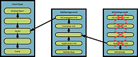 The following image shows the boundaries of a sandboxed application. The sub-applications are loaded into separate, sibling application domains. This means that each application contains its own class definitions so they can interoperate with applications that were compiled with different versions of the framework. The sub-applications are also in separate security domains. This separation means that they do not trust each other, and therefore have limited interoperability.