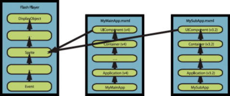 Sub-applications in a sibling application domain store their own class definitions, apart from the class definitions in the main application. The following image shows the class definitions of a large, multi-versioned application. You can see that the sub-application uses its own definitions, which were compiled with Flex 3.2). The main application uses its own definitions, which were compiled with Flex 4.