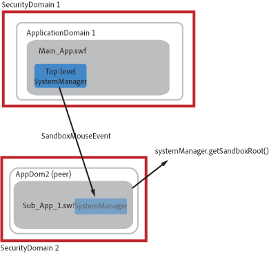 When loaded into a separate application domain, the topLevelSystemManager property refers to the sub-application's SystemManager because the main application's SystemManager is in another application domain. As a result, you do not use the topLevelSystemManager property to get a reference to the main application's SystemManager. Instead, you use the systemManager.getSandboxRoot() method to get a reference to the top-level SystemManager in the security domain. From this SystemManager, you can access all mouse activity in the current security domain.