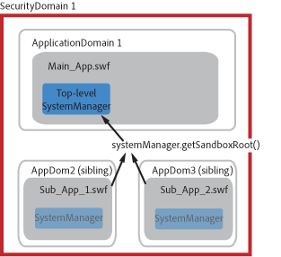 To get access to the top-level SystemManager in an architecture where sub-applications are loaded into child application domains, you use the topLevelSystemManager property of the SystemManager. The following image shows that the sub-applications use the systemManager.topLevelSystemManager to access the SystemManager in the main application.